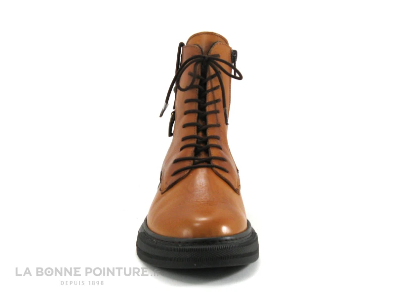 Cette chaussure montante Femme Karyoka est en cuir souple et nuancé marron camel, ornée d’une lanière sur le côté externe avec un triangle bronze.