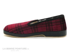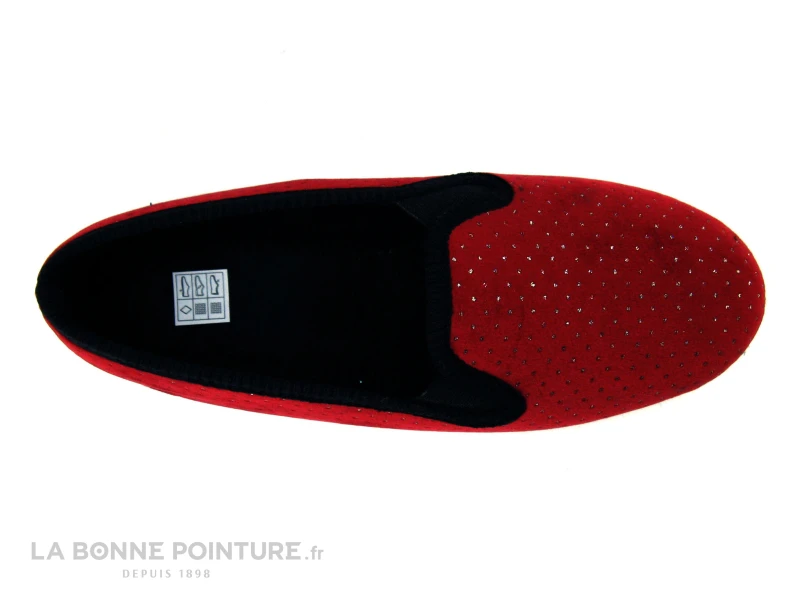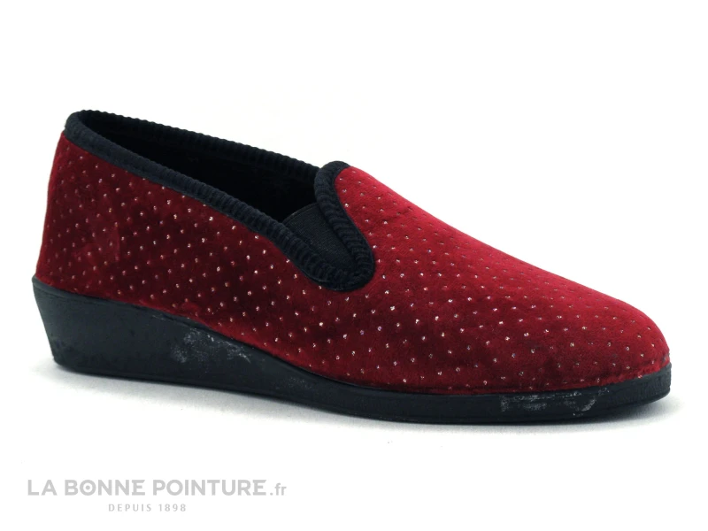 Ce chausson Femme est en velours bordeaux à pois argentés, avec le pourtour noir et 2 élastiques au niveau du coup de pied.