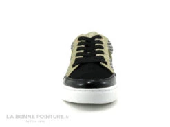 Une large lanière effet python caractérise la chaussure, aux tons de marron et de noir.